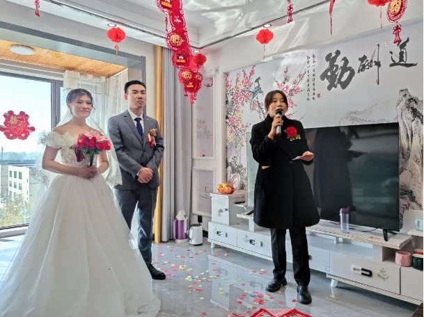 10月7日,周口市太康縣疫情反撲,政府加強(qiáng)了封控措施,太康·建業(yè)城業(yè)主陳女士原本定于10日舉辦的婚禮不得不取消。但為了不留遺憾,陳女士計(jì)劃一家人在家舉行一個(gè)簡(jiǎn)單的儀式。貼心管家趙穎超得知情況后,便利用物業(yè)現(xiàn)有資源在樓道、電梯間等處鋪設(shè)了紅毯,并主動(dòng)充當(dāng)婚禮儀式的司儀,董炯、靳阿慧兩名物業(yè)員工則分別負(fù)責(zé)拍攝和化妝,三人分飾三角,一同代表物業(yè)為這對(duì)新人送上最美的祝福。